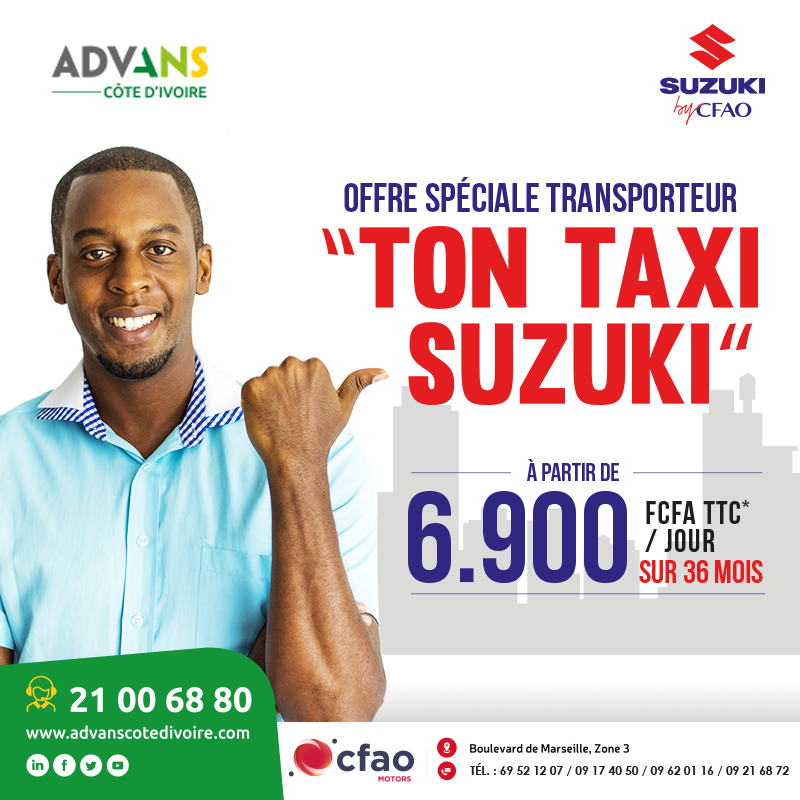Vous êtes transporteur et vous voulez rajeunir votre parc auto ? Suzuki By CFAO en partenariat avec ADVANS Côte d'Ivoire vous donnent l’opportunité d’acquérir des véhicules neufs à partir de 6.900 FCFA par jour sur 36 mois. Infoline: 21 00 68 80 / 21 75 15 00 ou RDV dans notre showroom Babi Motors.